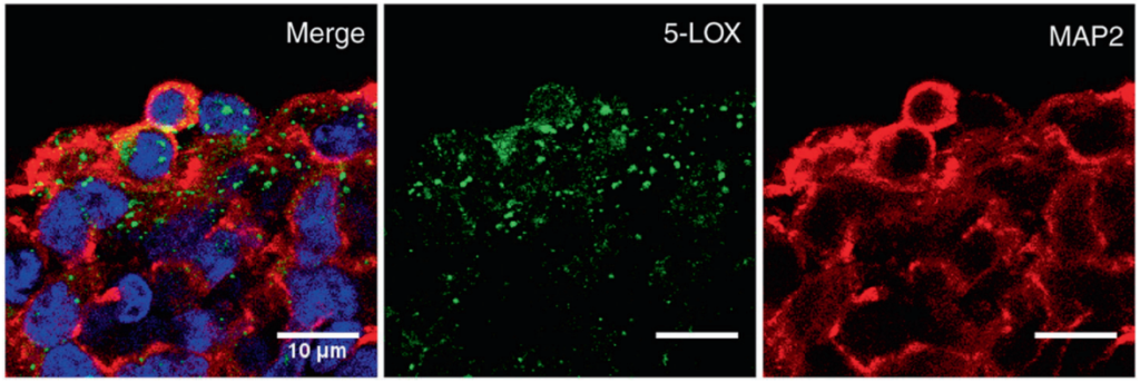 In addition, immunofluorescence (another technique that allows the evaluation of antigen distribution in a sample) demonstrated the presence of 5-lipoxygenase (5-LOX), the enzyme responsible for the production of LXA4 in brain organoids (Image). This dataset raises the possibility that neurons and microglia are involved in the supply of LXA4 to the human brain.
