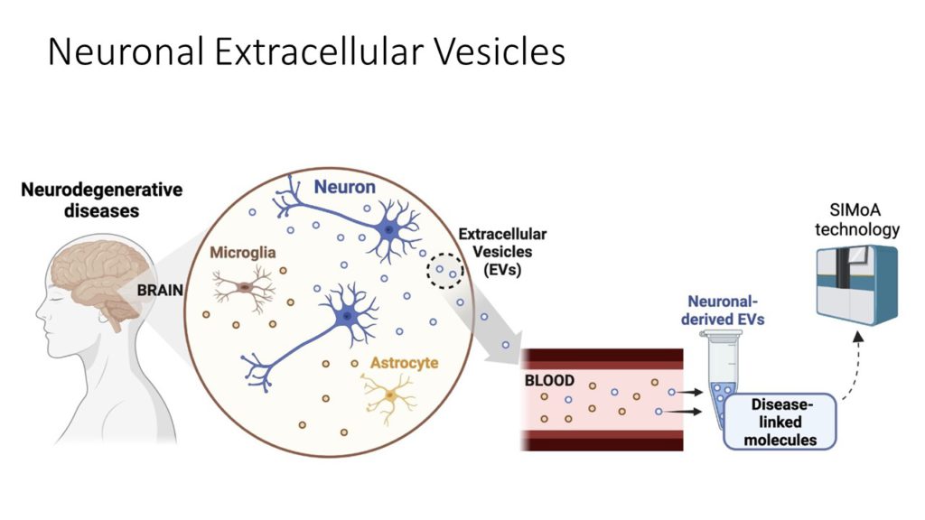 In addition to investing in the future of less invasive exams, both in Alzheimer’s Disease and neurocovid (neurological complications caused by COVID-19), Dr. De Felice focuses on the analysis of small components, the extracellular vesicles, which are produced by all cells in the body, including brain cells. These vesicles, secreted by the cells, hold within them the signature of the parent cell and important biomarkers. Most conveniently, they are able to cross the blood-brain barrier, going from the brain’s environment to the blood with information that gives clues to the brain’s biochemistry. “We are developing a methodology for isolating vesicles derived from neurons to look at disease biomarkers that reflect what’s happening in the brain”, reveals the researcher.